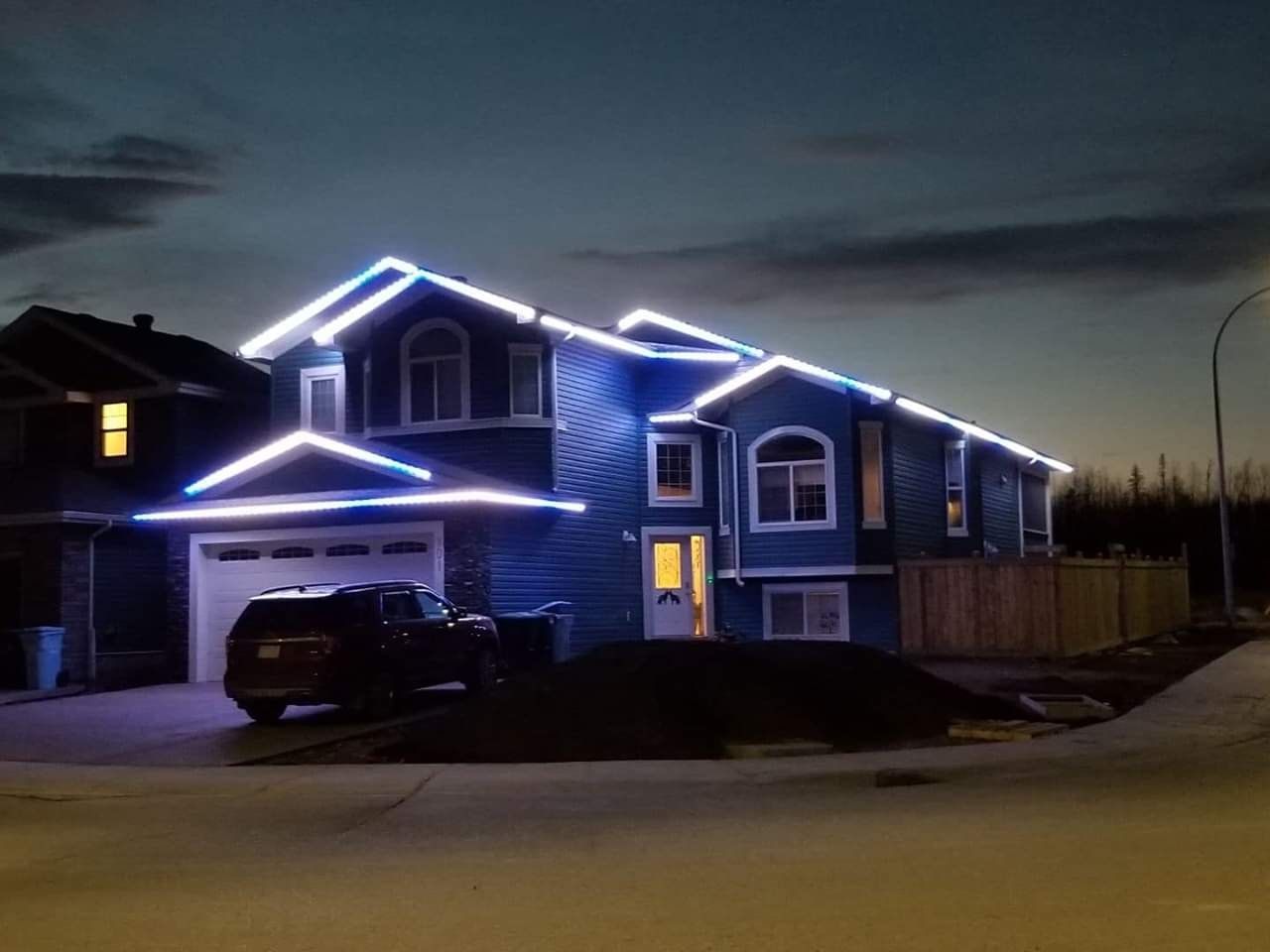Clean blue LED roofline highlighting modern home design