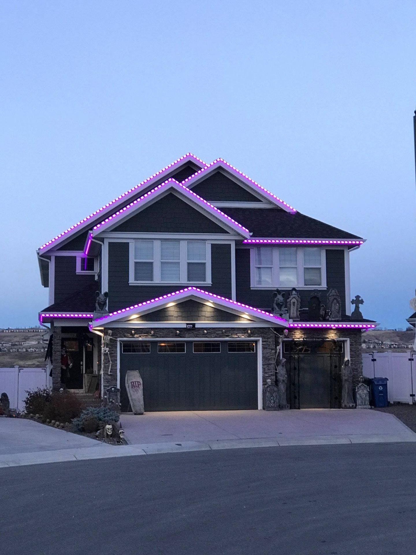 Stunning purple LED roofline installation creating dramatic curb appeal